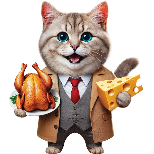 Sous-produits d'origine végétale, viande et sous-produits animaux (dont 14% de poulet), céréales, huiles et graisses, extraits de protéines végétales, lait et produits laitiers (dont 4% de poudre de fromage), substances minérales.