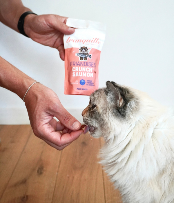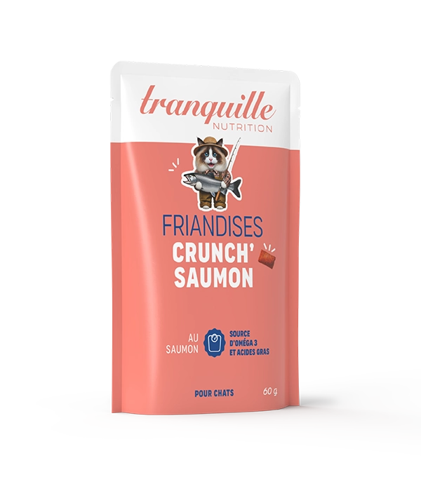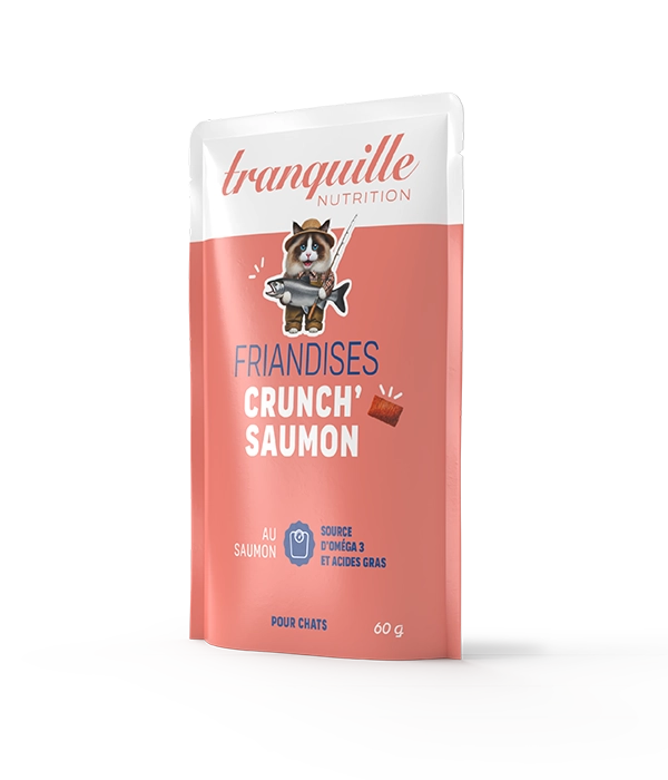 Nos friandises Crunch' Saumon sont naturellement riches en Oméga 3 et en acides gras. Les Oméga 3 permettent de réduire les inflammations, notamment articulaires, tout en soutenant les fonctions cérébrales. Les acides gras nourrissent sa peau, favorisant un pelage brillant et une peau saine. Une recette simple et savoureuse, pour un vrai plaisir gourmand tout en contribuant à l'équilibre de votre compagnon.