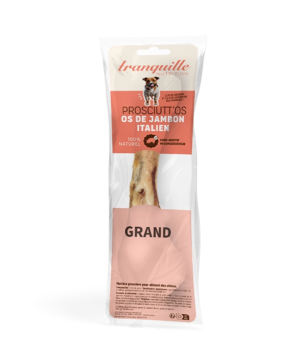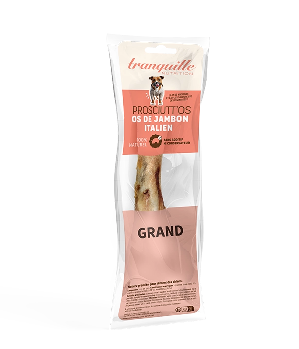 Os 100 % naturel, friandise idéale pour satisfaire l’instinct de mastication de votre chien. Sans additifs ni conservateurs, nos Prosciutt'Os sont riches en protéines et en calcium afin de renforcer le système osseux de votre animal. Ils contribuent également à l’hygiène dentaire en réduisant la formation de plaques de tartre.
