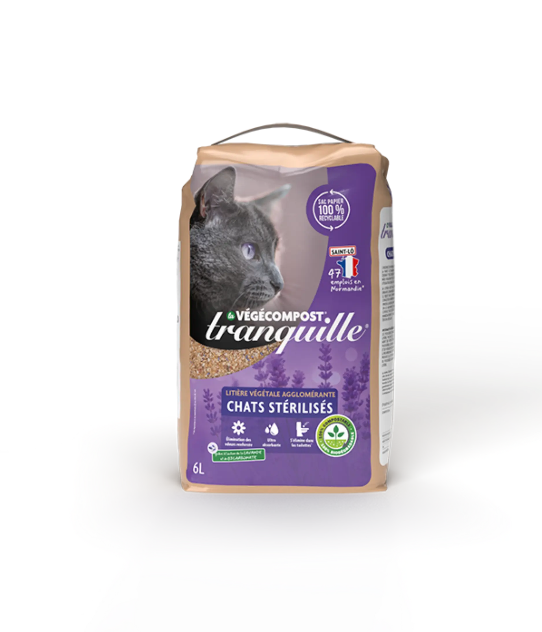 Outre son fort pouvoir d’absorption des liquides et des mauvaises odeurs, la litière Tranquille Végécompost est légère, très efficace et pratique grâce à son nouveau sac papier recyclable.